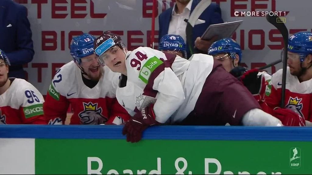 Tshekin Matej Stransky esitti torstaina yhden MM-kisojen komeimmista taklauksista, kun hän lennätti Latvian Kristians Rubinsin Tshekin vaihtoaitioon, mikä sai Stranskyn joukkuetoverit repeämään riemuun.