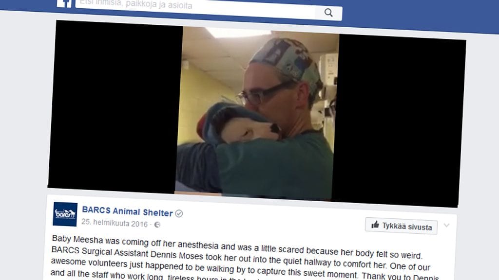 Amerikkalaisen BARCS Animal Shelter -eläinsuojan videolla Dennis Moses lohduttaa koiraa, joka on hämmentynyt leikkauksen jälkeen. Moses juttelee Meesha-koiralle ja suukottelee siitä. Video on vuodelta 2016.