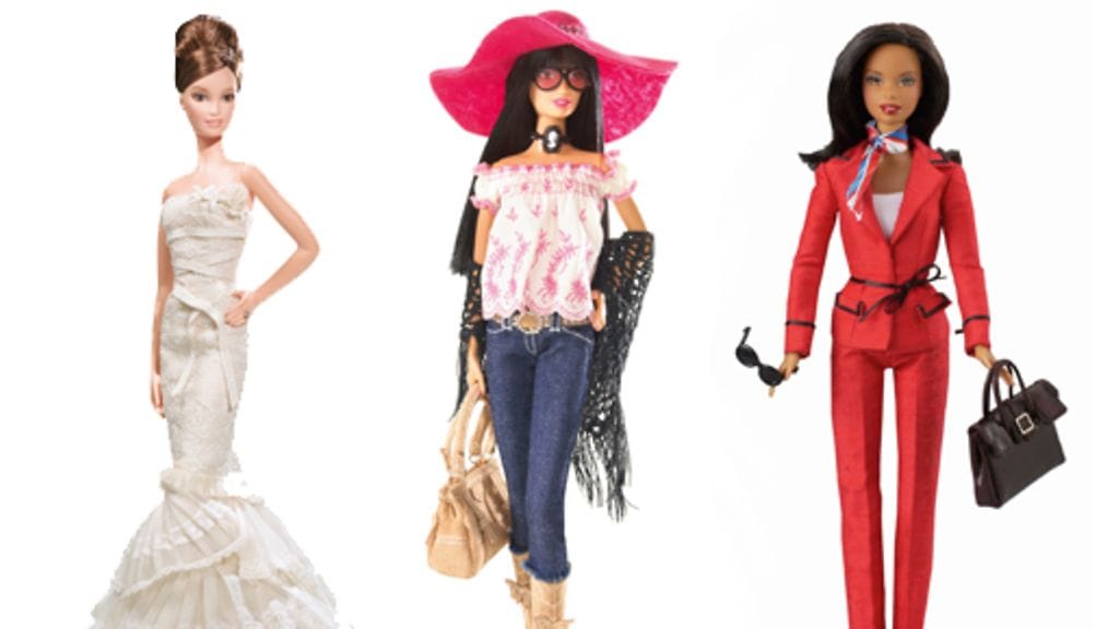 Kuvassa Barbie-muotia: Vera Wangin hääpuku 2008, Anna Suin tyyliä 2006 ja edistyksellinen presidenttiehdokasnukke 2004.