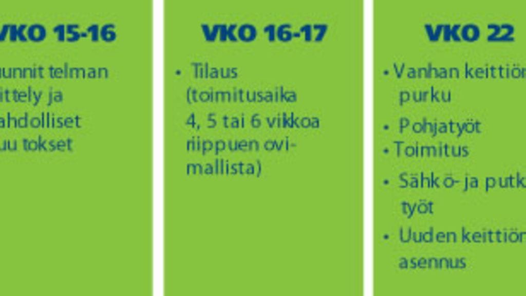 Haaveiletko uudesta, upeasta keittiöstä? Suunnittelu on parasta aloittaa hyvissä ajoin. Ovimallista riippuen keittiön toimitusaika on tilauksesta 4, 5 tai 6 viikkoa. Mutta myös moni muu työvaihe ottaa oman aikansa.