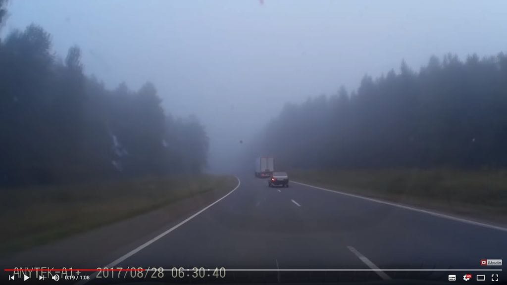 Oheisella videolla on siis kasassa kaikki katastrofin ainekset. Lada lähtee ohittamaan rekkaa, mutta joutuu perääntymään, kun sumun keskeltä tuleekin yllättäen auto vastaan. Ladan kuljettaja menee paniikkiin, menettää menopelinsä hallinnan ja päätyy ojaan.