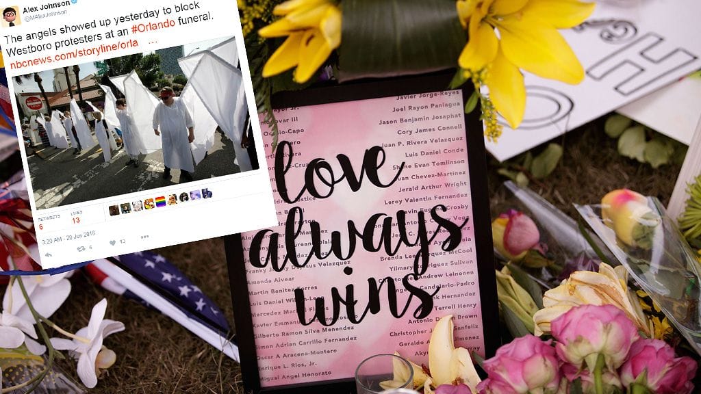 Homovastaisista kannanotoistaan tunnetun Westboron baptistikirkon mielenosoitus vaimennettiin enkelivoimilla Orlandon massa-ampumisen uhrien muistotilaisuuksissa.