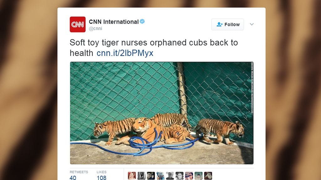 Luonnonsuojelualueen työntekijät alkoivat imettää kolmea orpoa tiikerinpentua pehmotiikeristä Intiassa, kertoo CNN.