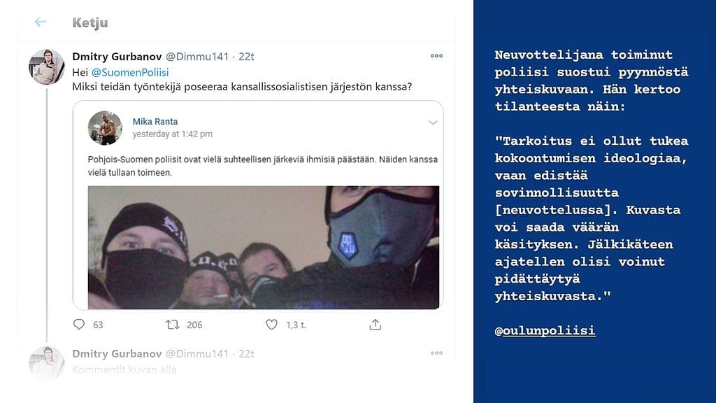 – Kuvanottotilanne liittyy virkatehtävään Oulussa itsenäisyyspäivänä 6.12. Kyseessä oli neuvottelutilanne kokoontumisrajoituksista ja yleisestä järjestyksestä ja turvallisuudesta, Suomen poliisi kirjoittaa Instagramin tarina-päivityksessä.