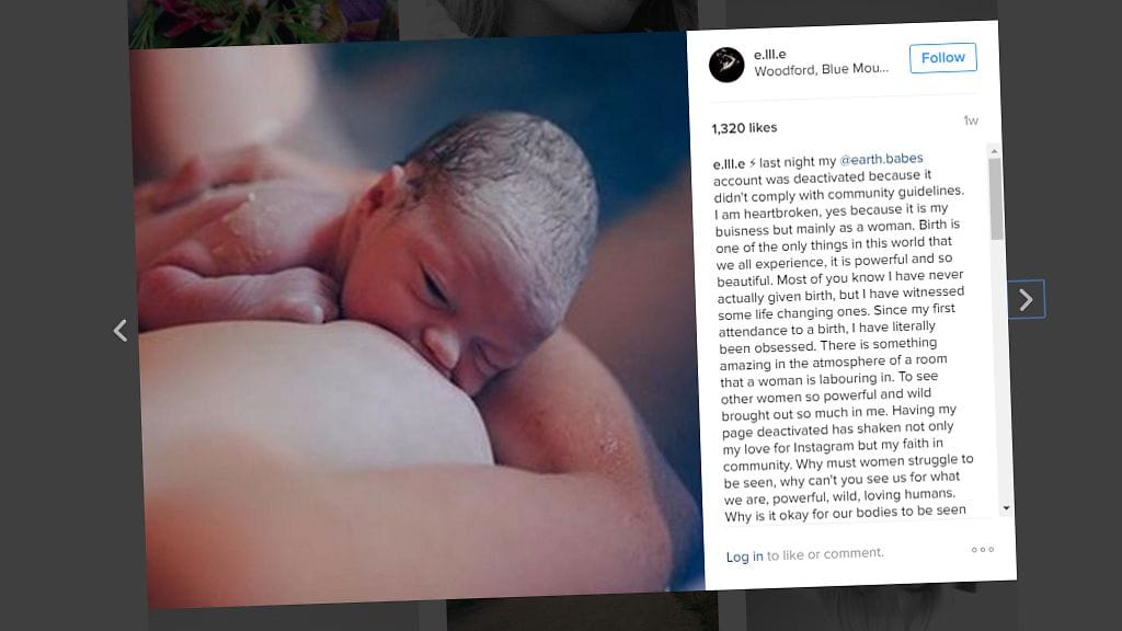 Kuvat synnytyksestä ja imetyksestä olivat Instagramille liikaa. Earth Babes -nimisen tilin ylläpitäjä ja valokuvaaja Elle Wickens, 21, kertoi henkilökohtaiselle Instagram-tilillään, että tili oli suljettu.