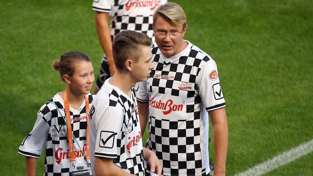Vuonna 2000 syntynyt Hugo marssi ylpeänä jalkapallokentällä isänsä ja vuonna 2005 syntyneen Aina sisarensa kanssa.