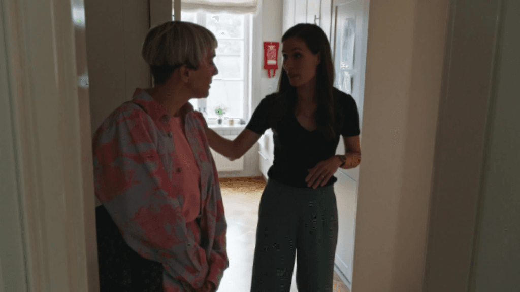 Kaksikko suuntaa talon sisälle yläkertaan ja Marin vie jääkaappiin itse tekemänsä juustokakun, jota kaksikko maisteli hetkeä aikaisemmin Kesärannan terassilla.