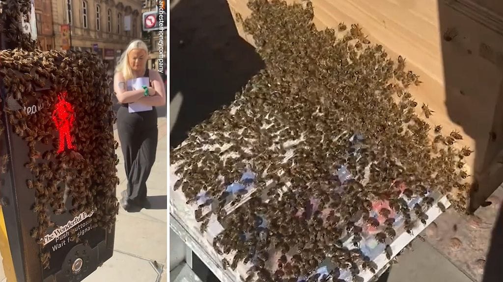 Joukko mehiläisiä asettui asumaan manchesterilaisen suojatien liikennevalotolppaan.