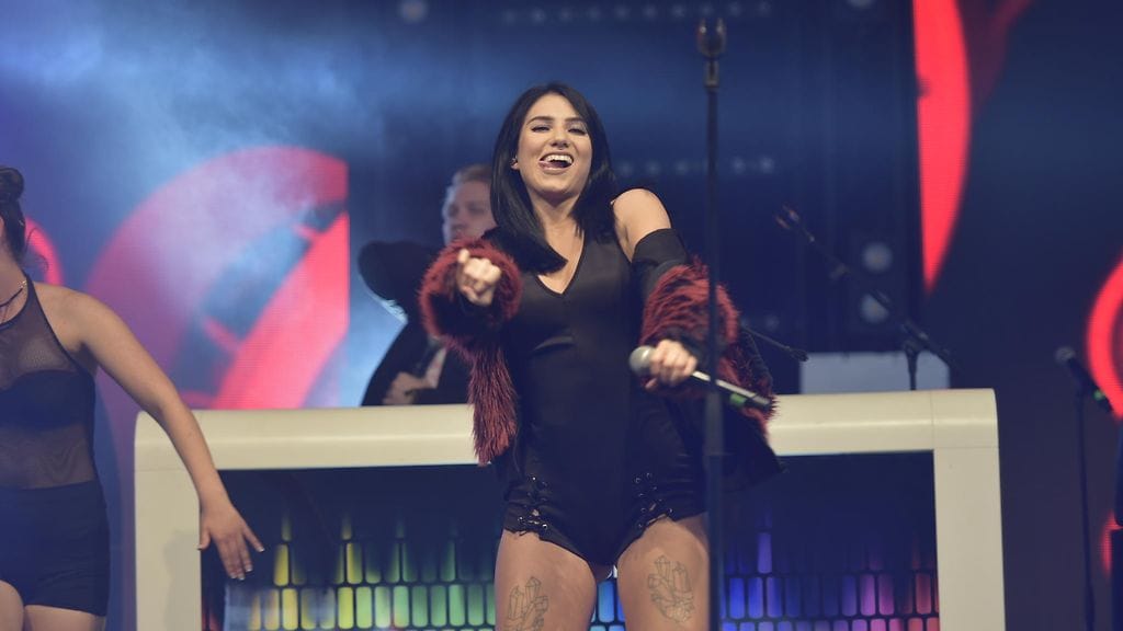 Laulajatar Evelina esiintyi Blockfesteillä Tampereella lauantaina. Artistitulokas oli valinnut melko rohkean esiintymisasun.