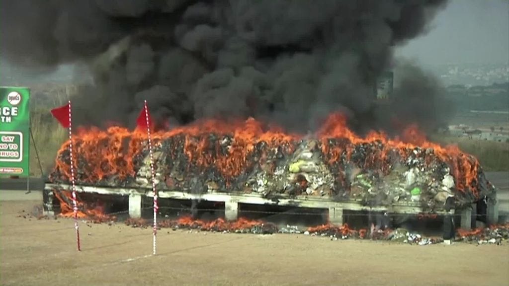 Viranomaiset järjestivät polttamisen pääakaupunki Islamabadin laitamilla. Katso yläpuolelta löytyvältä videolta, kun iso määrä laittomia huumausaineita muuttuu savuksi.