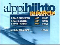 Norjalaisten pujottelijoiden Naganossa aloittama hallinta jatkui sunnuntaina Korean Jong Pjongissa. Konkari Ole Kristian Furusethin johdolla norjalaiset ottivat maailmancupin kisassa kolmoisvoiton. Albertvillen olympiavoittaja Finn-Christian Jagge oli toinen ja viime vuoden maailmanmestari Tom Stiansen kolmas.