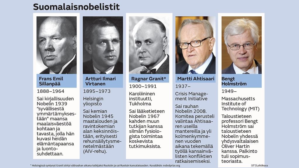 Suomalaisia Nobel-palkinnon saajia on nyt yksi enemmän. Tänään selvisi, että taloustieteen Nobel-palkinnon saavat tänä suomalainen taloustieteen professori Bengt Holmström ja Britanniassa syntynyt taloustieteen professori Oliver Hart sopimusteoriasta. Mutta ketkä suomalaiset ovatkaan saaneet kyseisen palkinnon aiemmin?