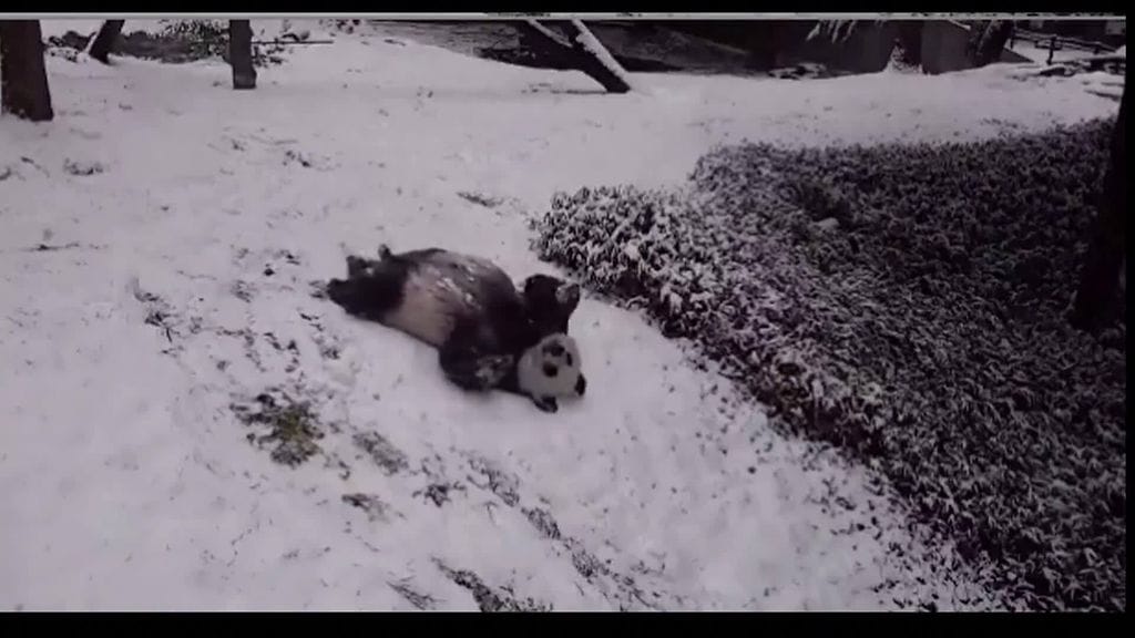 Pandat heittäytyivät selälleen X-asentoon ja antautuivat lumisen mäen vietäviksi. Pandojen häkkiin asennettu kamera taltioi pandapariskunnan talviset leikit.