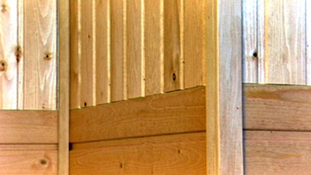 Kun alaosa oli valmis, kiinnitettiin loput viisi vaakalautariviä, joista ylimmästä ajettiin urospontti pois. Kun myös vaakaosan yläreuna oli näin saatu tasaiseksi, pystylaudoitus asennettiin samalla tavalla kuin seinän alaosassa. Listaa ei tarvittu tähänkään saumakohtaan. Nurkkiin sen sijaan laitettiin listat, jotka olivat nyt aitoa leppää.
