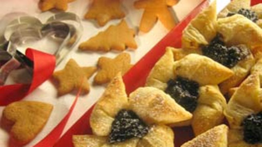 Levitä taikinalevyt leivinpaperille uunipellille ja anna niiden sulaa n. 15 minuuttia. Leikkaa levyt neliöiksi ja tee neliöiden kulmiin vinot viillot kohti tortun keskustaa (puoleen väliin). Nosta joka toinen kulma ylös ja nipistä ne keskelle alas painaen suppuun. Laita lusikallinen paistonkestävää hilloa/marmeladia tortun keskelle, voit halutessasi maustaa sen piparkakkumausteella.