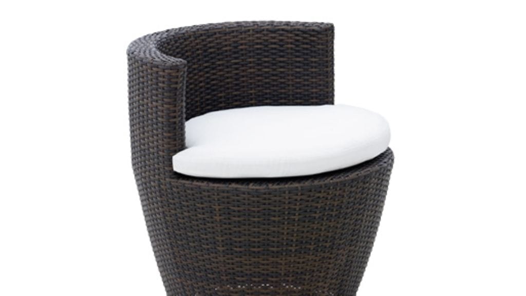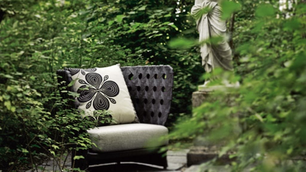 B & B Italia Outdoorin valmistama Canasta-nojatuoli CN98PB on punottu muoviremmistä. Runko on maalattua alumiinia. Koko 96,5 x 79 x 87 cm. 2 770 euroa, hintaan sisältyy tyyny, Funktio.