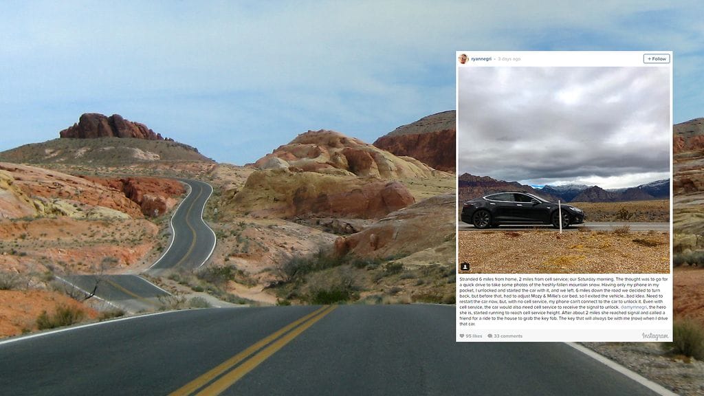 Kuljettaja, Ryan Negri, oli nimittäin jättänyt auton fyysisen avaimen kotiin, koska arveli pärjäävänsä Teslan mobiilisovelluksella kanjonikierroksen ajan.