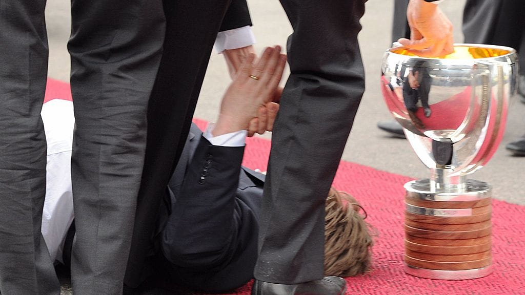 Kaksikko selvitti portaat, mutta Nurminen horjahti punaisella matolla maahan ja löi päänsä Leijonien mestaruuspokaaliin.