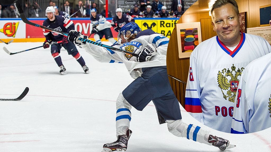 Harri Laineesta napsaistiin Suomen MM-puolivälierän jälkeen kuvia, joissa hänellä oli Aleksandr Ovetshkinin nimellä varustettu Venäjän pelipaita päällä.