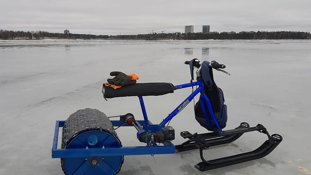 Keksintö on jäällä kulkeva menopeli, joka jaksaa kyydittää kaksi aikuista akkuporakoneen voimalla.