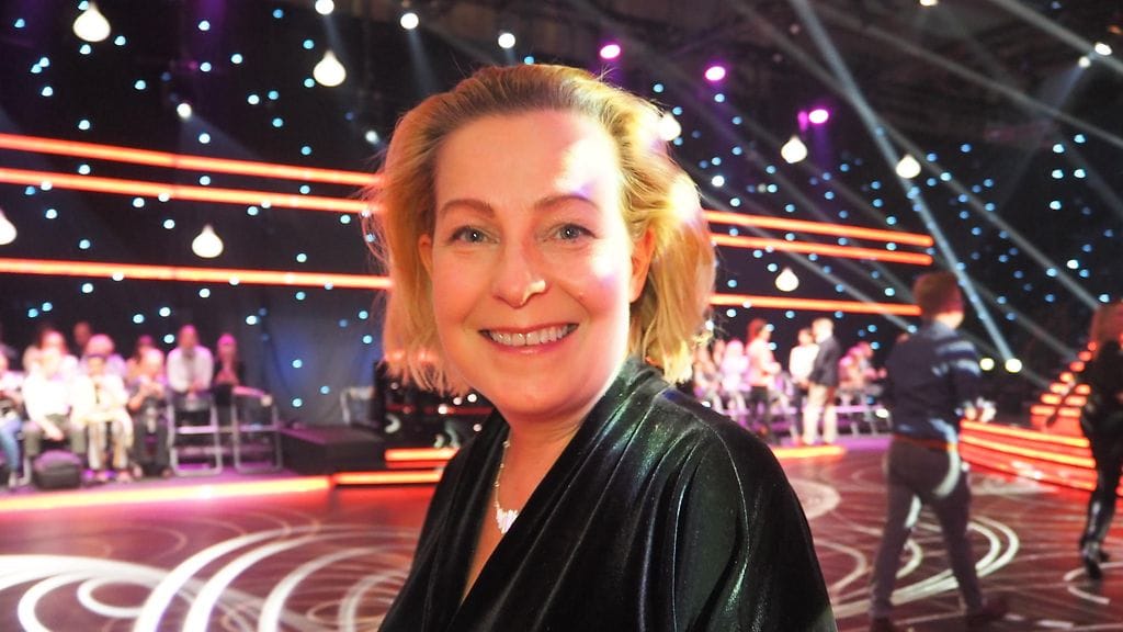 Ohjelman katsomossa tähtitanssijaa kannustaa oma puoliso, toimittaja Mari Sarolahti.