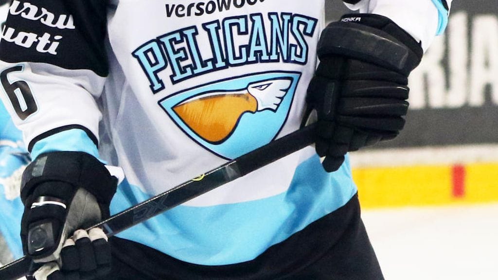 Pelicans-pelaa ottelun erikoispelipaidoissa. Valkoista ja vihreää väriä yhdistelevissä paidoissa on Lahden urheilukeskuksen tuttuja maisemia.