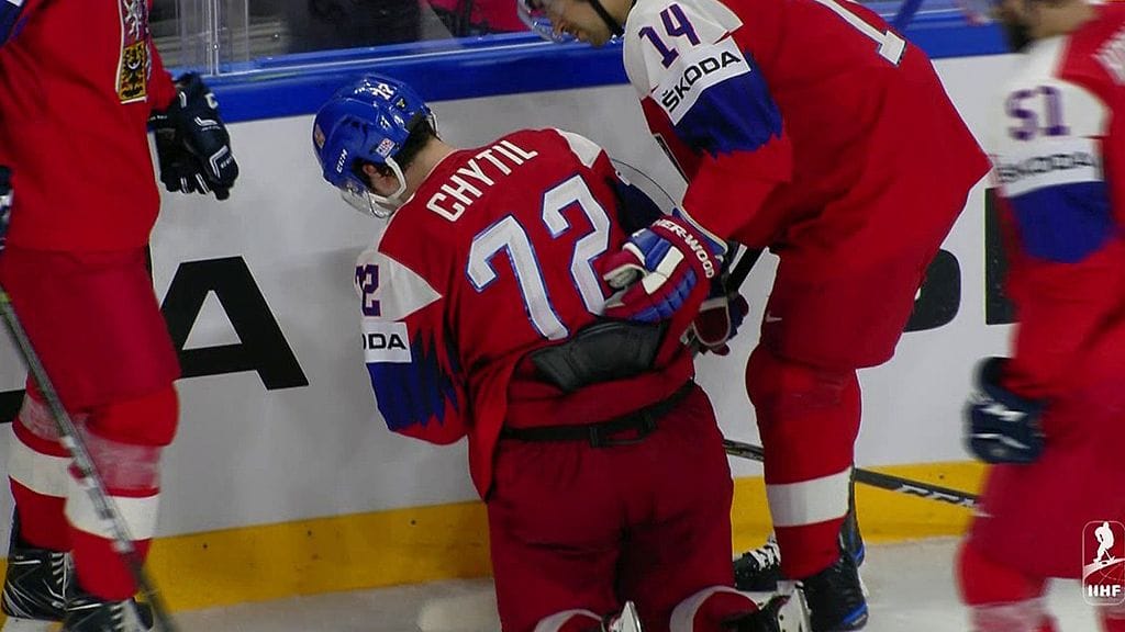 Ranskan Jonathan Janilin kyynärpää osui taklaustilanteessa Chytilin päähän toisessa erässä ja tshekkihyökkääjä lysähti pelottavan näköisesti jäähän. Häntä hoidettiin hetken aikaa jäällä, ja lopulta Chytil talutettiin vaihtoaitioon.