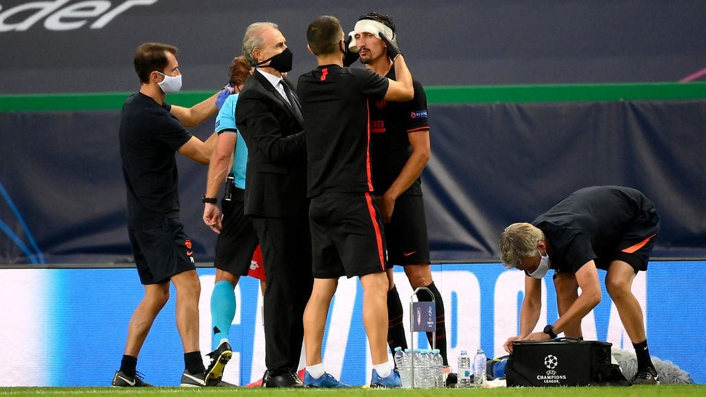 Atlético Madridin Stefan Savic ja RB Leipzigin Marcel Halstenberg kolauttivat päät kovavauhtisessa törmäyksessä yhteen Mestarien liigan puolivälieräottelussa torstai-iltana Lissabonissa.