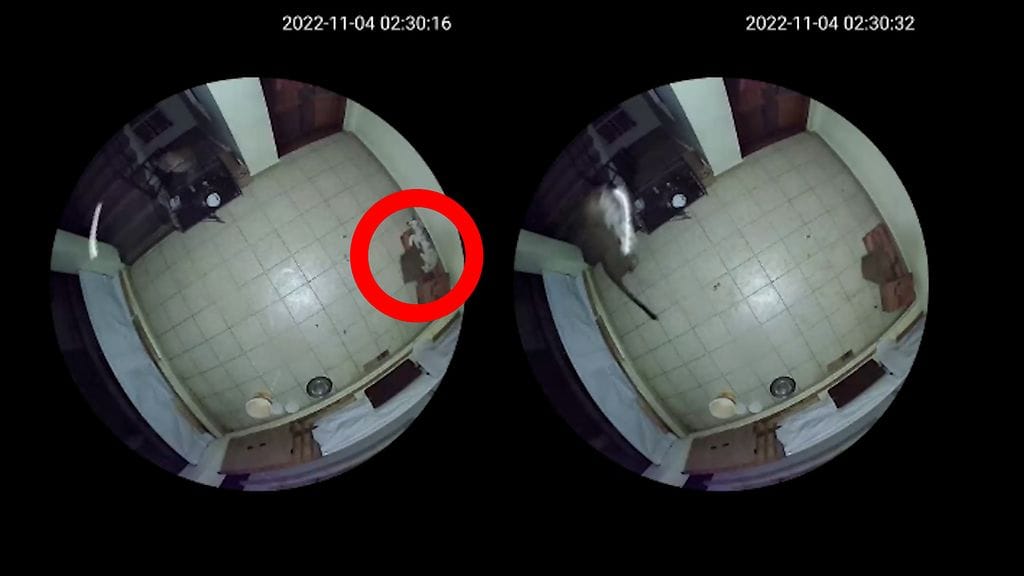 Valvontakameravideolta on nähtävissä, kuinka leopardi vie mukanaan perheen lattialla nukkuneen koiran ja pakenee paikalta.