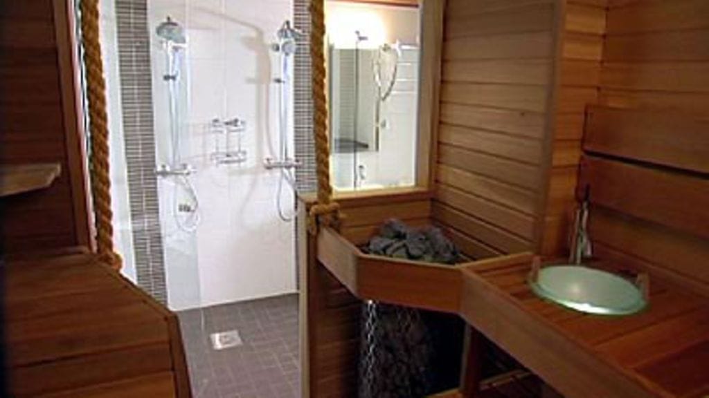 Perheasunnon pesutilat viimeisteltiin asentamalla lasiseinät, -ovet ja erilaiset kannakkeet ja altaat kaappeineen. Tässä tehtiin nyt jotain sellaista, mikä oli uutta kaikille – niin Ninalle, Reiskalle kuin Arillekin: lähes kaikki kalusteet valittiin ja tilattiin internetin kautta. Kokeilu osoittautui kannattavaksi ja kokemukset hyviksi.