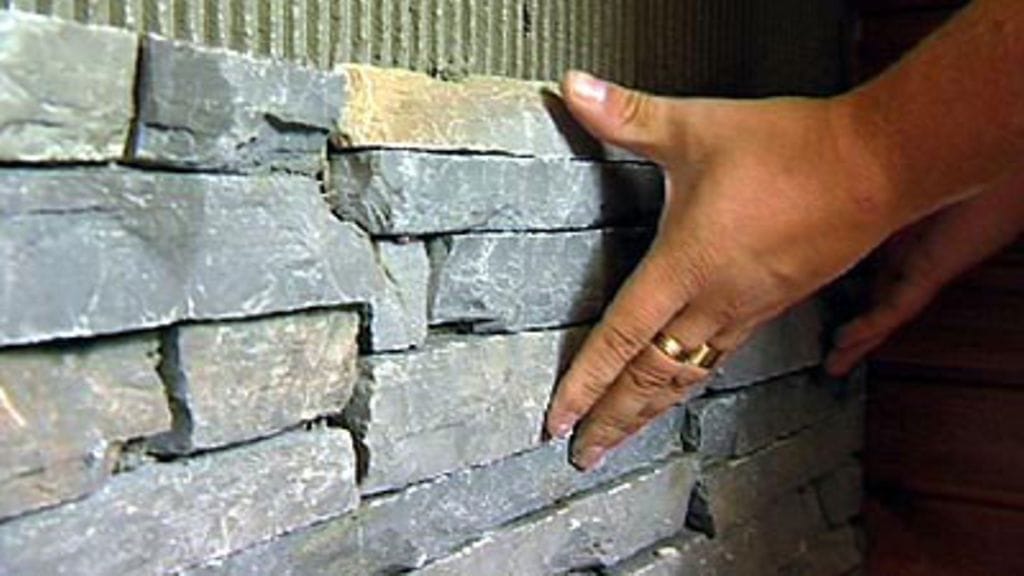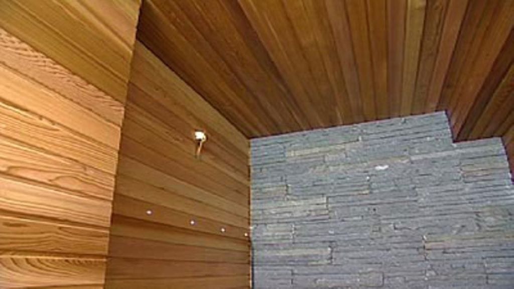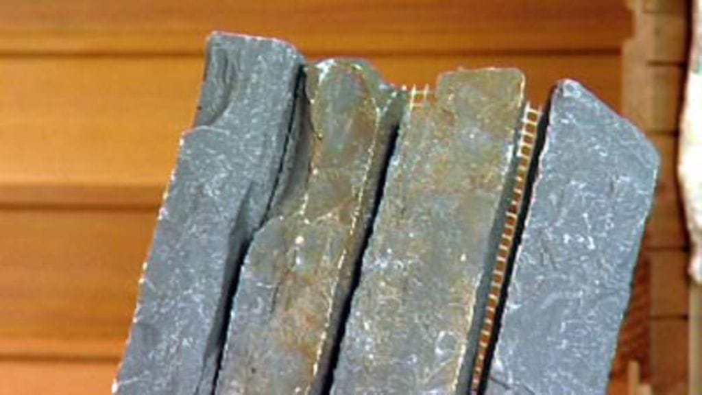 Nina suunnitteli saunan takaseinäksi luonnonkiviseinän. Siihen voi nojata oikein hyvin - tosin selän ja seinän välissä tarvitaan selkänoja. Ne valmistettiin samasta tuijasta kuin seinätkin ja asennettiin hiukan vinoon, jotta olo on rennompi.
