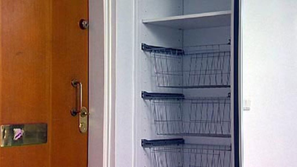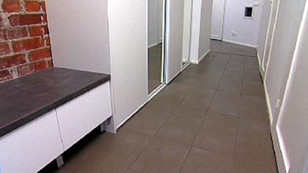 Nina halusi jättää eteisen vanhan tiiliseinän näkyviin siten, että se muodostaa eteiskomeroiden takaseinän. Sen pinta kuitenkin lakattiin, ettei siitä tartu pölyä vaatteisiin. Komerorivin toiseen päähän tuli matala vetolaatikosto, jonka päällä voi istua esimerkiksi vetäessään kenkiä jalkaansa.