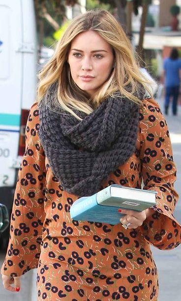 Näyttelijä Hilary Duff, 26, kuvattiin Hollywoodissa pukeutuneena persikanväriseen pitkähihaiseen tunikaan ja suureen, harmaaseen kaulaliinaan. Tummansininen kukkakuviointi väritti vaaleaa tunikaa. Jalassaan näyttelijällä oli ruskeat nilkkurit. Kaulaan kiedottu suuri kaulaliina olisi tuskin välttämättömyys Kalifornian lämmössä, mutta asua voi soveltaa myös Suomen syksyyn lisäämällä tyyliin paksut sukkahousut.