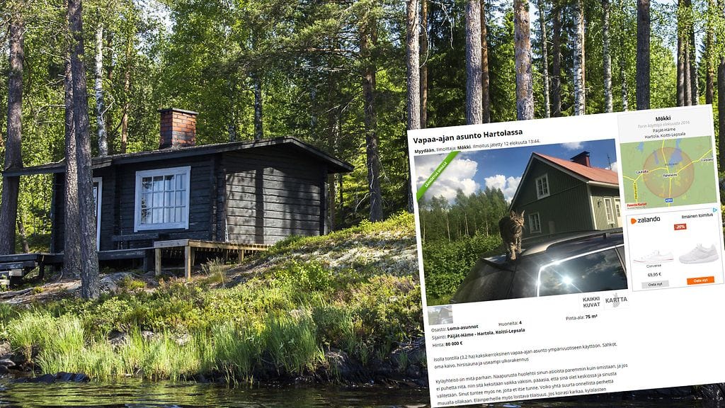 Kiinteistön esittelyn sijaan Tori.fi-palveluun ladattu myynti-ilmoitus keskittyy kuvailemaan alueen kyläyhteisöä. Lisäksi ilmoituksessa olevan kuvan pääosassa on mökin sijaan auton katolla oleva kissa.