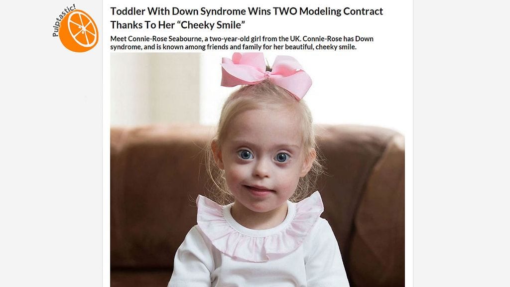 Pulptastic.com-sivusto kertoo brittiläisestä Connie-Rose Seabournesta, 2, jolla on Downin syndrooma ja jo kaksi mallisopimusta. Perheen ja ystävien kesken hänet tunnetaan kauniista, ”nenäkkäästä” hymystään.