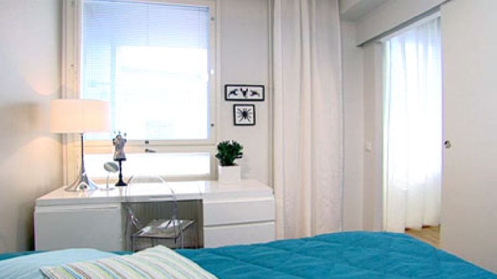 Suuria kalustemuutoksia ei pienikokoisessa makuuhuoneessa voitu tehdä. Huoneen mittasuhteet saatiin kuitenkin paremmin hyödynnettyä, kun olemassa oleva sänky ja työ/meikkipöytä sijoitettiin uusille paikoille. Pöytä on nyt ikkunan edessä, jolloin siinä työskennellessä voi välillä katsoa ulos ja ehostusta tehtäessä voidaan hyödyntää luonnonvaloa. Työpöydän päälle hankittiin näyttävä pöytävalaisin, joka on samaa sarjaa olohuoneen jalkavalaisimen kanssa. Olohuoneesta katsottuna sama teema toistuu näin myös makuuhuoneessa ja värityskin mukailee olohuoneen värimaailmaa.