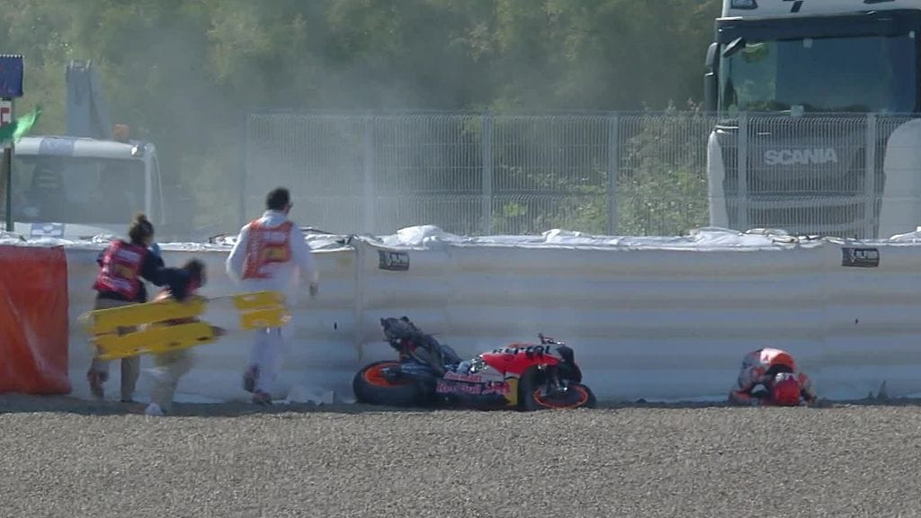 Hondan Marc Marquez pelästytti Espanjan GP:n kolmansissa vapaissa harjoituksissa kaaduttuaan kovavauhtisesti päin ratavallia.