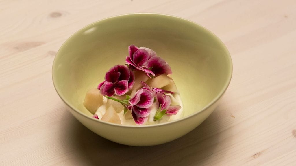 Teemu Laurell valmisti pikatehtävässä jogurtti-mascarponemoussen, marinoidut päärynät ja marinoidut kukat.