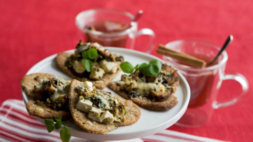 Rapeat kana-fetaleivät toimivat loistavasti makean glögin kanssa. Yrteillä maustetut ruisnapit kuorrutetaan juustolla. Kanan lisäksi täytteeseen voi käyttää savulohta, kinkkua tai jauhelihaa.