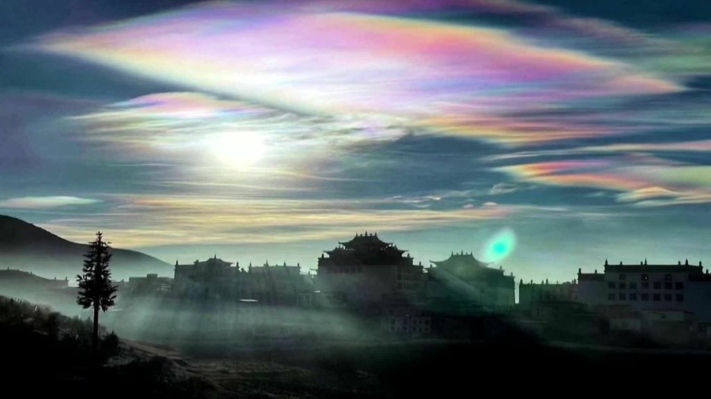 Shangri-La on Dêqênin tiibetiläisten autonominen prefektuuri Yunnanin maakunnassa, Kiinassa. Sateenkaaripilviä nähtiin myös Dalin ja Kunmingin kaupungeissa samana päivänä.