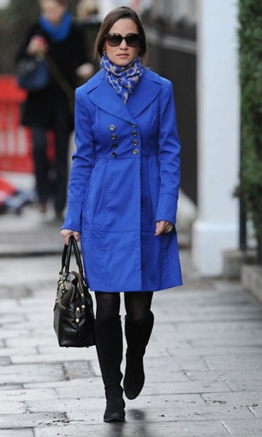 Koleassa säässä Pippaa lämmitti Ted Bakerin sähkönsininen trenssi, jossa oli leveät kaulukset ja kaksirivinen napitus. Takin kaveriksi kaunotar oli valinnut Beulah Londonin sinisydämisen huivin, joka on nähty naisen kaulassa aikaisemminkin.