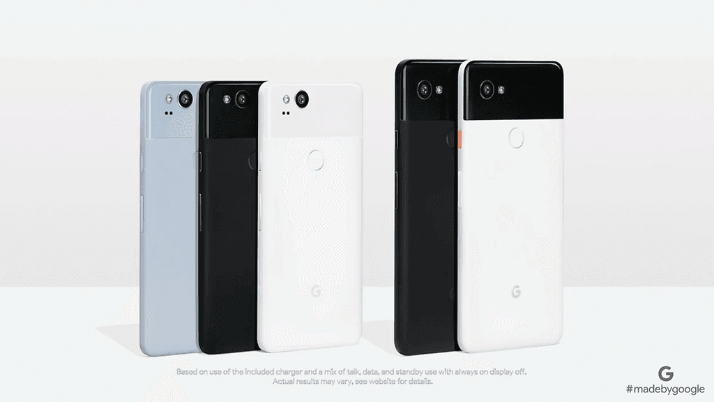 Pixel 2 tulee saataville kolmena värivaihtoehtona ja Pixel 2 XL kahtena värivaihtoehtona, joista toinen yhdistää mustan ja valkoisen.
