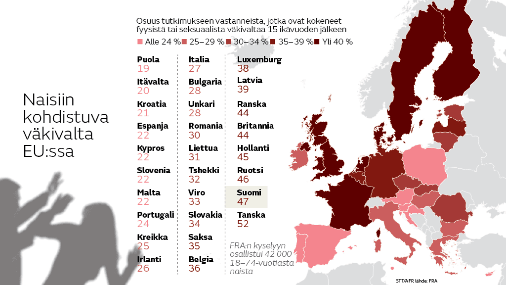 Tuoreen EU-tutkimuksen mukaan 47 prosenttia suomalaisnaisista on kokenut joko fyysistä tai seksuaalista väkivaltaa 15 ikävuoden jälkeen. Luvussa ei ole mukana henkistä väkivaltaa kokeneita naisia.