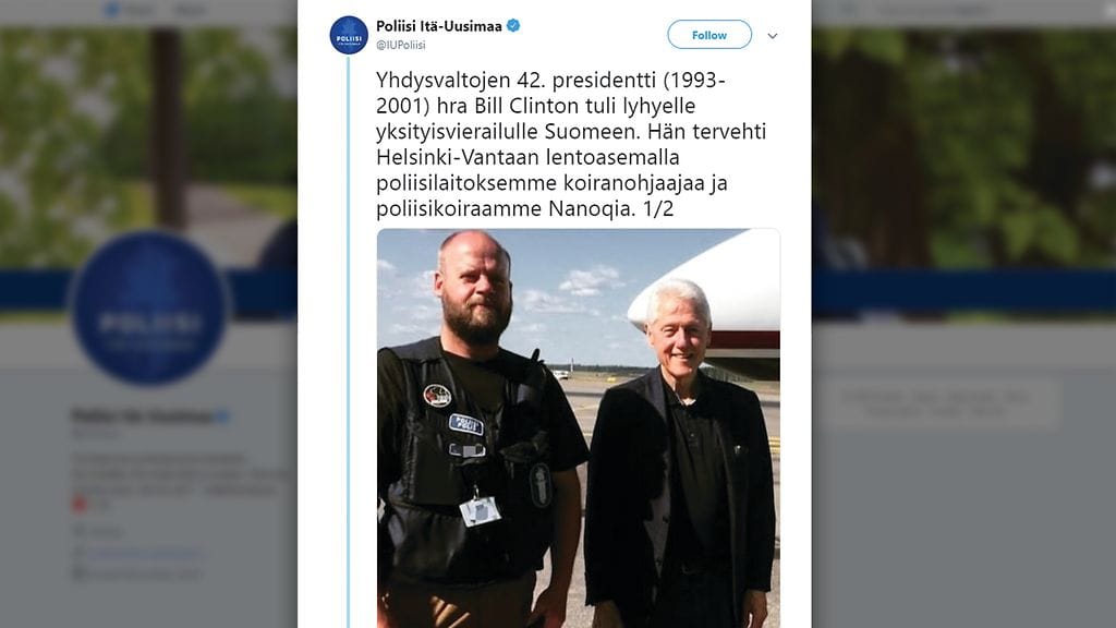 – Clinton oli rento, hyväntuulinen ja kehui poliisikoiraamme, poliisi kertoo twitterissä.