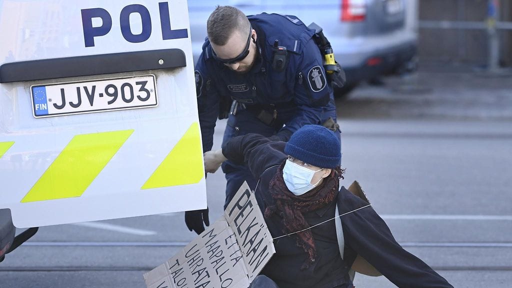Poliisi poisti kadulla istuneita mielenosoittajia ajoradalta Helsingissä ja Tampereella tiistaina.