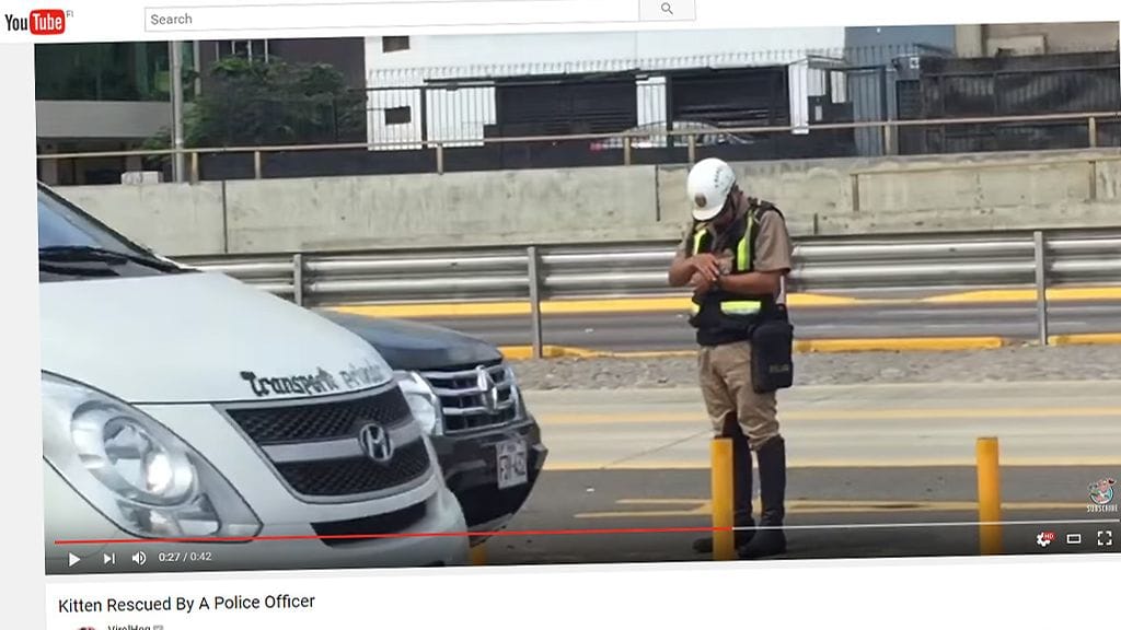 Viral Hog -sivuston jakama video näyttää, kuinka poliisi pysäyttää tiellä matkaavien autojen kulun päästäkseen pikkuisen kissanpennun luokse. Poliisi nostaa pennun syliinsä ja kantaa nopeasti turvaan.