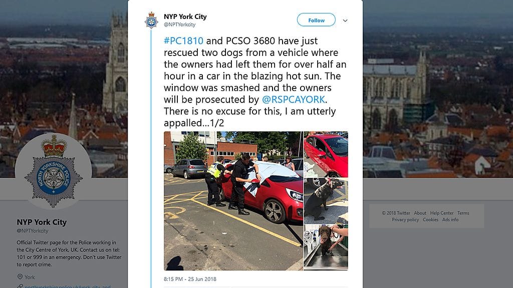 Yorkin poliisilaitoksen viranomaiset kertoivat Twitter-päivityksessään, että paikallinen eläintensuojeluviranomainen aikoo syyttää auton omistajaa koirien hengen vaarantaneesta teostaan.