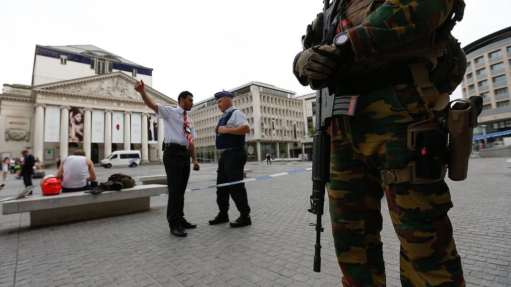 Poliisi piirittää miestä Brysselin keskustassa pommiuhan takia. Miehellä on yllään pitkä takki, jonka alta näkyy johtoja.