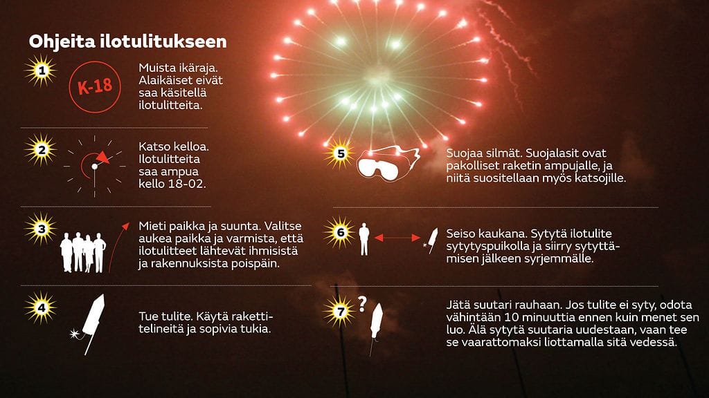 Lisäksi alkoholin vaikutuksen alaisena ei ilotulitteita saisi ampua. Myös suojalasit on lain mukaan muistettava.