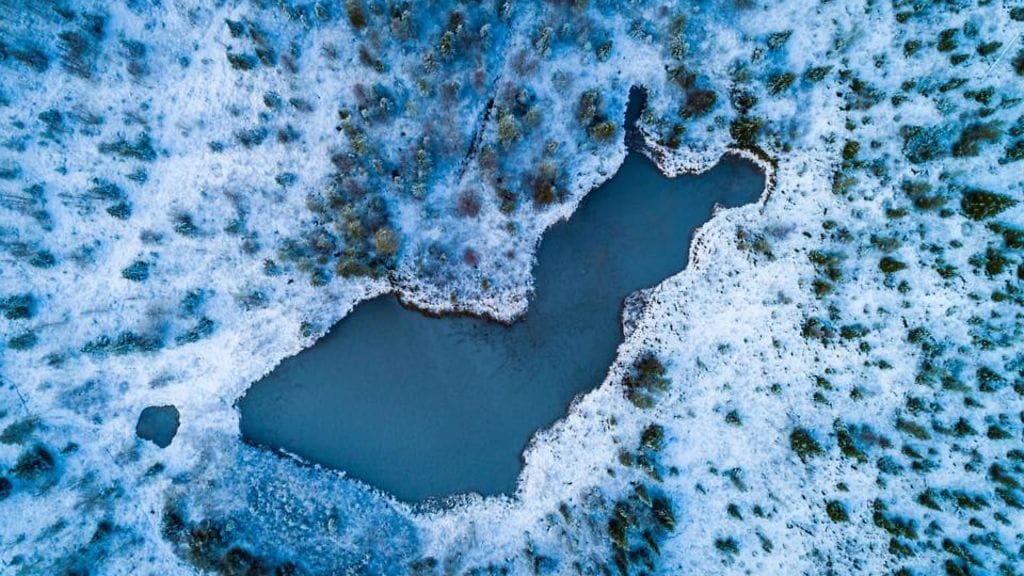 Suomi-neitoa muistuttava tekolampi on saanut ympärilleen pakkaslunta, ja miehittämättömällä lennokilla kuvattu otos antaa näkyyn uuden näkökulman.